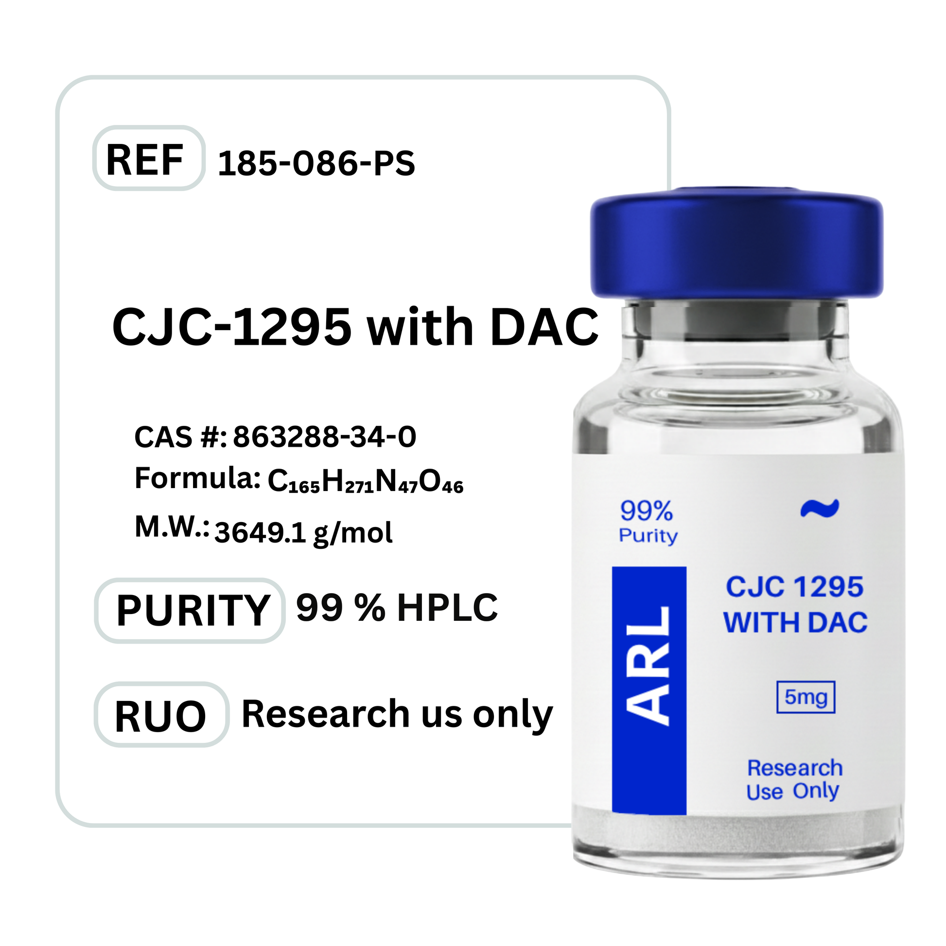 CJC-1295 with DAC is distributed in sterile, lyophilized powder form suitable for laboratory research. To protect the structural integrity and functional properties throughout storage duration, the powder should be kept at –20°C in the desiccated state. Following dissolution into aqueous solution, the resulting liquid must be handled aseptically and refrigerated at 2–8°C for short-term experimental applications. Compliance with these storage specifications maintains chemical integrity and eliminates the potential for chemical degradation or biological contamination during handling procedures.